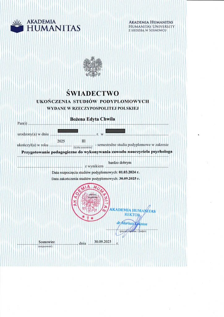Psychologia towarzyszy mi od zawsze – najpierw jako ciekawość człowieka, jego emocji i sposobu, w jaki przeżywa świat. Z czasem ta ciekawość przerodziła się w pasję, a pasja w powołanie, dzięki któremu mogę dziś towarzyszyć innym w odkrywaniu spokoju, sensu i wewnętrznej równowagi.